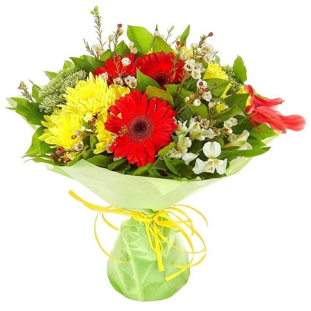Это невероятно яркий и красочный букет, который состоит из красных гербер и ярко-желтых хризантем. Особой необычности и выразительности цветочной композиции придают альстромерии, символизирующие дружеское расположение, а также богатство и процветание. Герберы призваны дарить улыбки, так как они считаются цветами радости и веселья. Красочный насыщенный букет станет отличным способом попросить прощение у дорогого вам человека, ведь при первом взгляде на него мгновенно забываются все обиды.